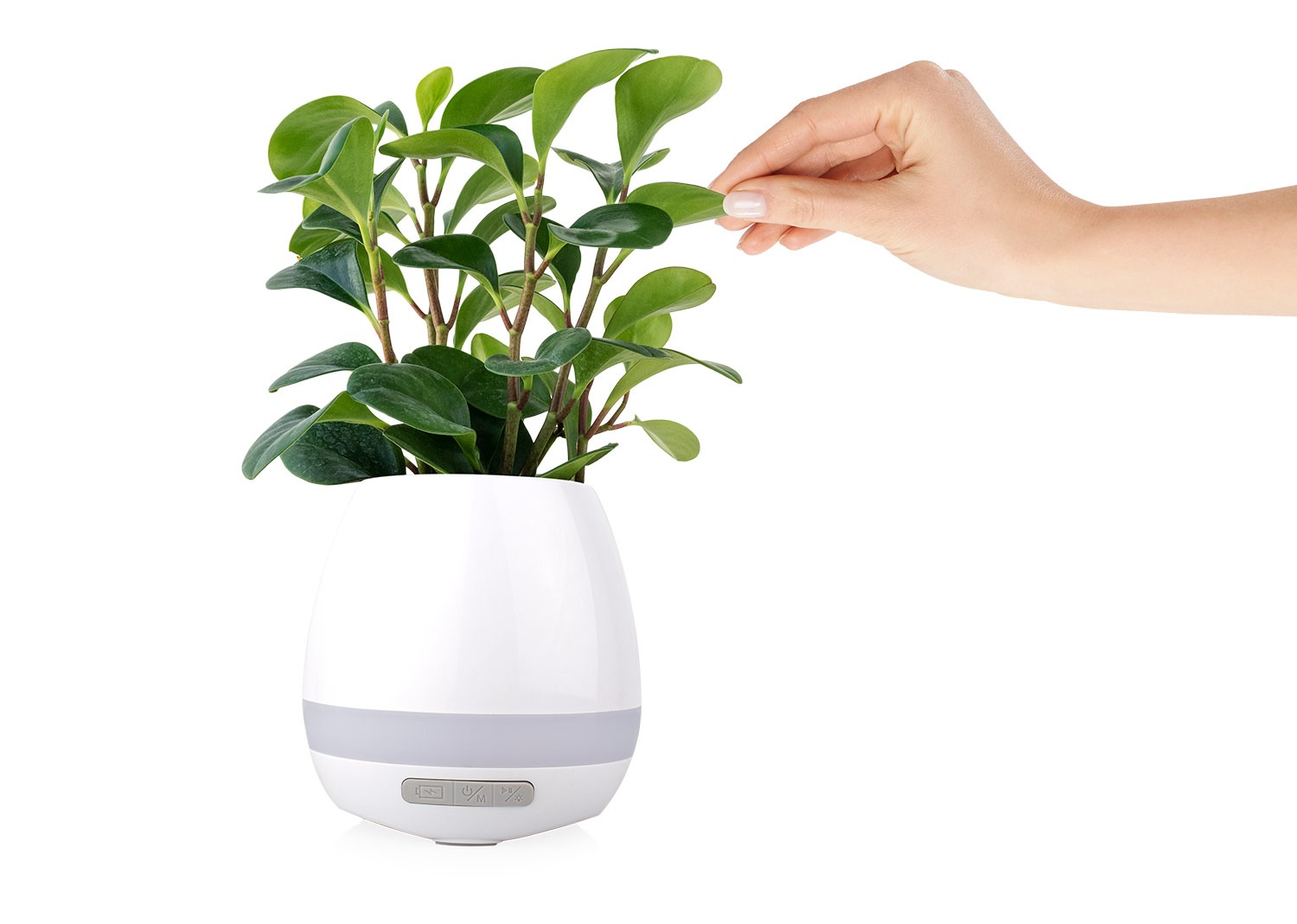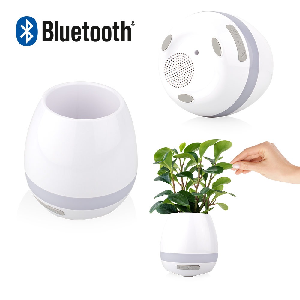 Altavoz Bluetooth con diseño multifuncional que incluye luz LED decorativa y maceta con sensores táctiles que permiten reproducir sonidos al tocar la planta; cuenta con puerto micro USB para carga, botón de control de iluminación con 7 colores disponibles, y diseño inferior con salida de agua para mantener la planta en buen estado. Ofrece conexión Bluetooth 5.0 con alcance de hasta 10 metros, altavoz de 5W, batería de 1,200 mAh con hasta 12 horas de reproducción, y controles básicos para reproducción, encendido/apagado y cambio de modo. MATERIAL: ABS MEDIDAS: Formato: (Diámetro X Alto): (Ø 10,7 X 11,9). Peso: 240 gr. ÁREA DE IMPRESIÓN APROXIMADA: Tampo / DTF UV: (6,5 X 1,5). MARCA: SE SUGIERE: Tampografía / DTF UV 1 tinta. EMPAQUE: 30 Unidades en caja máster de: 24,5 cm x 41 cm x 59 cm; Peso Bruto: 12/11. Kg; Peso Neto: 0 Kg EMPAQUE INDIVIDUAL: Caja blanca INVENTARIO: 1020