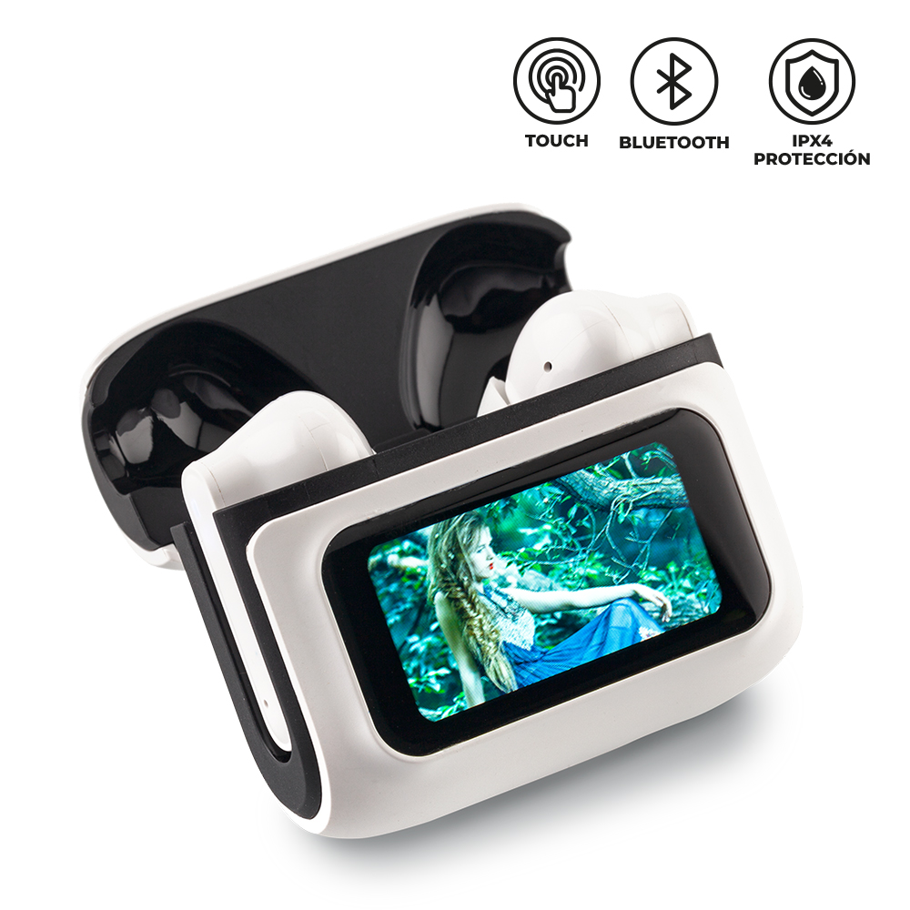 Audífonos Bluetooth plásticos. Versión Bluetooth: 5.4. Capacidad batería: 300 mAh. Tiempo de carga del estuche: 3-4h. Tiempo de carga de audífonos: 1h. Duración reproducción: 3-5h. Mandos por touch. Resistente al agua (no sumergible), IPX4. El estuche funciona con pantalla táctil inteligente con huella dactilar, que permite: Control de música. Ajustes de volumen. Reemplazo de fondo de pantalla. Personalización de efectos de sonido. Cambio de idioma. Control de iluminación. Incluye cable Tipo C para carga.Empaque caja individual.Medidas Caja: 12 cm x 9 cm x 4 cm.Marca: 2.5 cm / Tampografía.Ficha Técnica