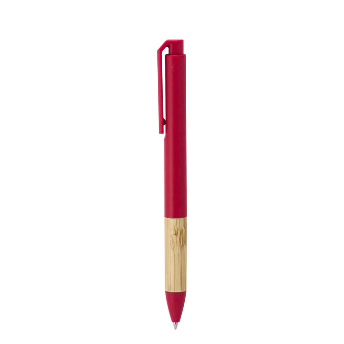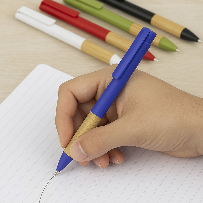 Bolígrafo retráctil. Cuerpo, puntera y pulsador de plástico reciclable. Agarre de bambú. Pintura acabado mate.