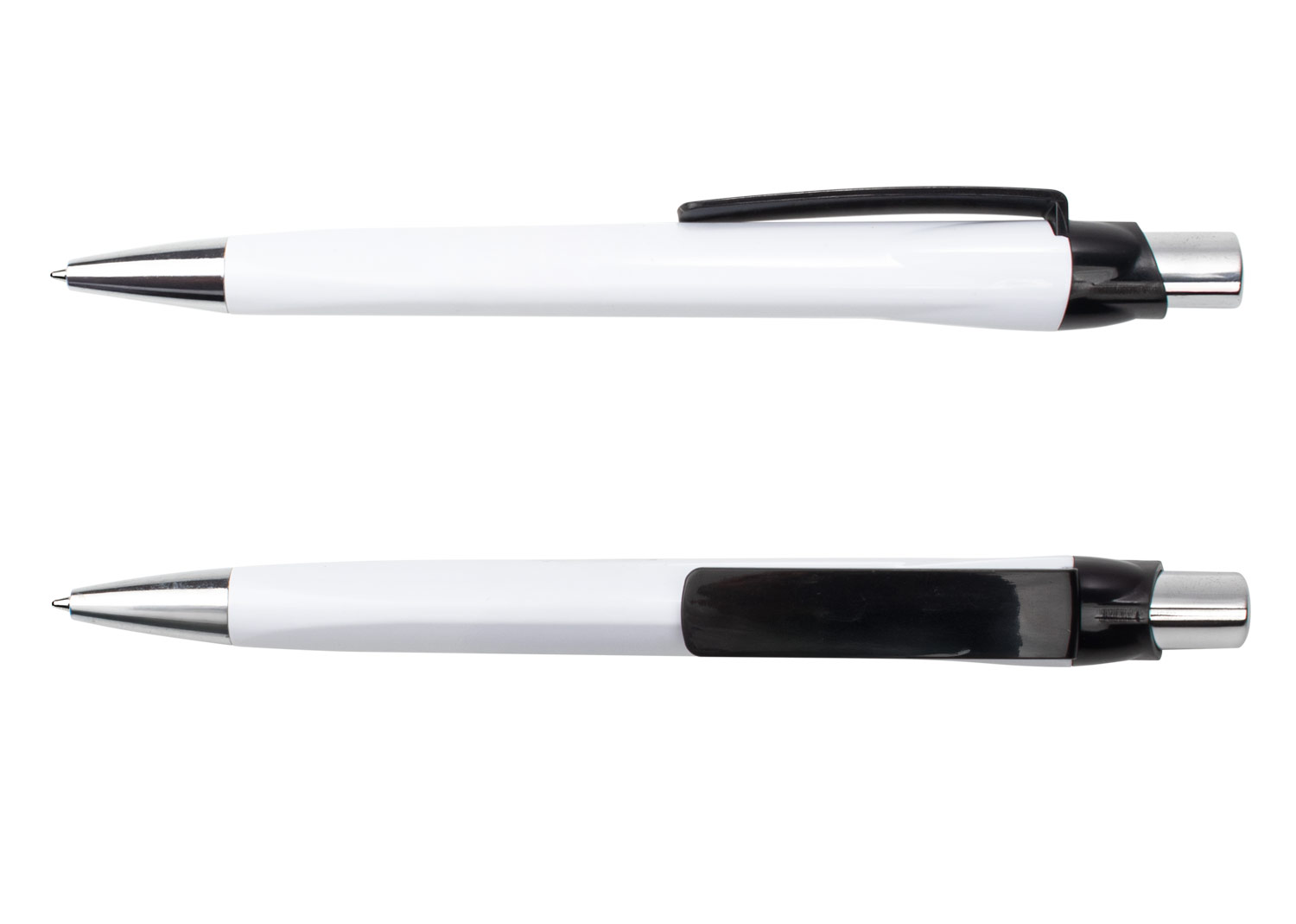 Bolígrafo con barril blanco sólido, clip de color sólido, punta y empujador cromados. Su diseño combina acabados modernos con funcionalidad, ideal para uso diario en entornos laborales o académicos. MATERIAL: Plástico ABS MEDIDAS: Formato: (Alto X Diámetro X Ancho con Clip): (14 X Ø 0,9 X 1,1). Peso: 9 gr. ÁREA DE IMPRESIÓN APROXIMADA: Tampo Clip: (3,5 X 0,7). Tampo Cuerpo: (6 X 0,7). MARCA: SE SUGIERE: Tampografía bolígrafos plásticos de hasta 5 tintas. EMPAQUE: 1000 Unidades en caja máster de: 31 cm x 20 cm x 48 cm; Peso Bruto: 10 Kg; Peso Neto: 9 Kg EMPAQUE INDIVIDUAL: Bolsa de plástico INVENTARIO: 13939