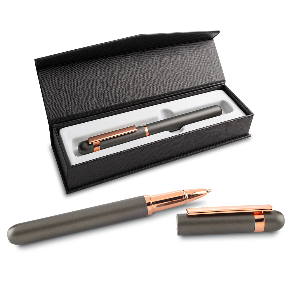 Bolígrafo metálico tipo roller. Empaque caja individual.Medidas: 13 cm.Marca: 3 cm / Tampografía / Láser.Venta mínima y en múltiplos de caja de 50 unidades por color.Ficha Técnica