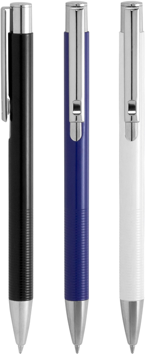 Bolígrafo retráctil. Cuerpo de aluminio en diferentes colores acabado mate. Botón, clip y puntera metálicos cromados.