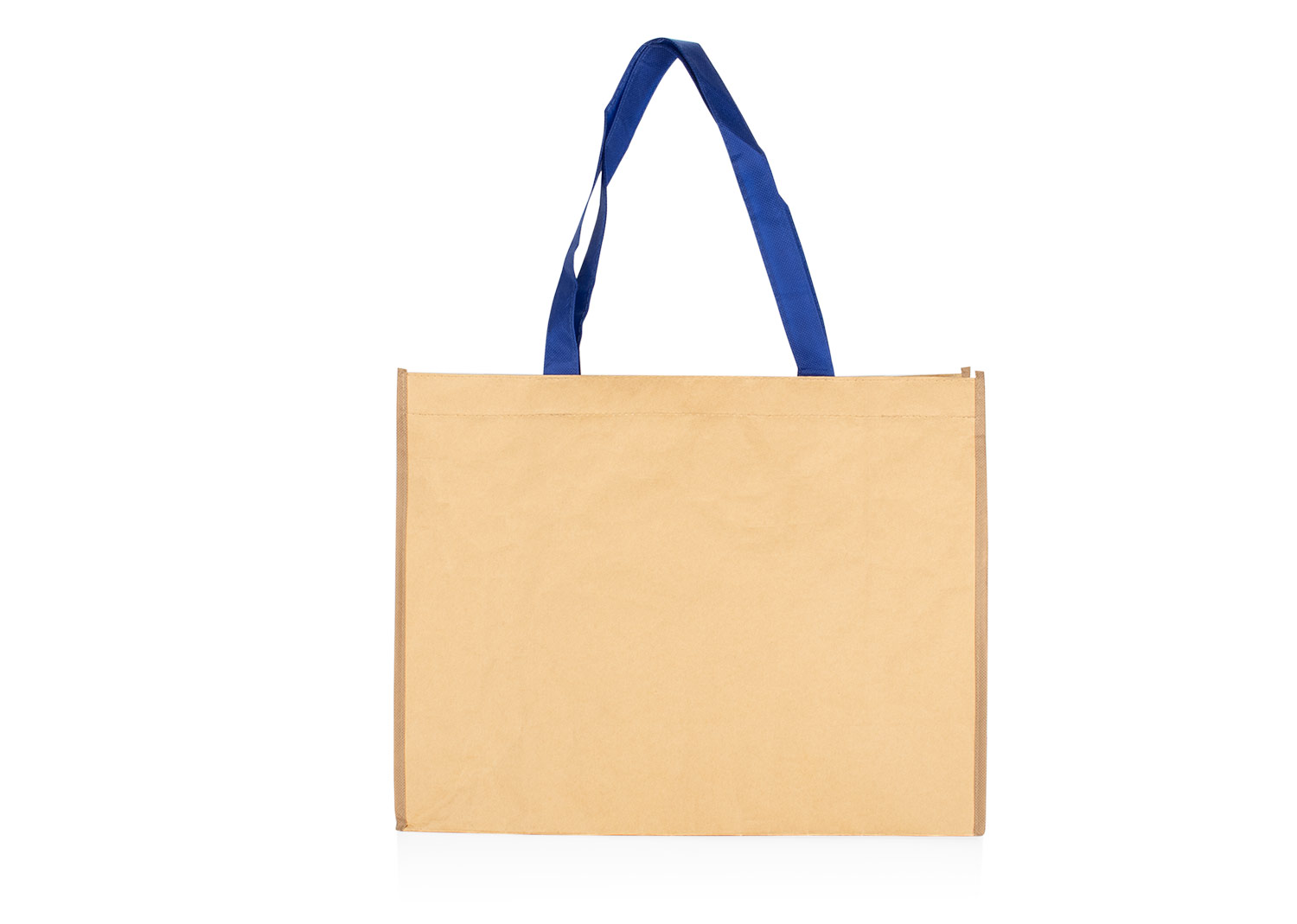Bolso tipo tote fabricado en tela no tejida compuesta de papel kraft, con mangos en tela no tejida de 80 g/m². Cuenta con un compartimento principal abierto, ideal para llevar documentos, compras o artículos personales. Su diseño es simple, espacioso y amigable con el medio ambiente. MATERIAL: Tela no tejida compuesta de papel kraft MEDIDAS: Formato: (Ancho X Alto X Profundo): (40,1 X 30,9 X 15,7). Asa: (51). Peso: 82 gr. ÁREA DE IMPRESIÓN APROXIMADA: Screen: (23 X 10). MARCA: SE SUGIERE: Screen 1 tinta. EMPAQUE: 200 Unidades en caja máster de: 36 cm x 36 cm x 43 cm; Peso Bruto: 11 Kg; Peso Neto: 12 Kg EMPAQUE INDIVIDUAL: Bolsa de polietileno INVENTARIO: 0