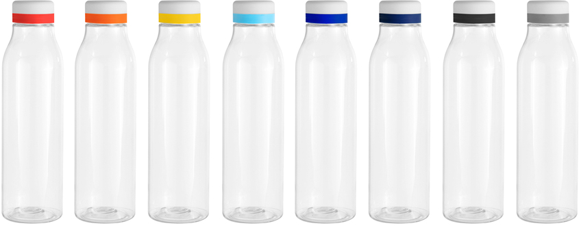 Botella de plástico transparente con tapa a rosca color blanco mate con anillo de silicona de diferentes colores.