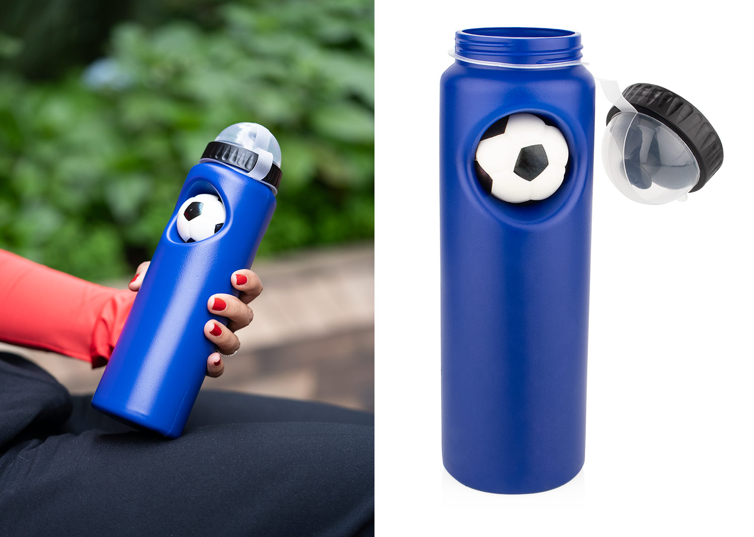 Botella deportiva de PE, ideal para actividades físicas. Su diseño incluye un antiestrés con forma de balón de fútbol (Ø 4,7), que se puede insertar y retirar del cuerpo de la botella, ofreciendo una función lúdica y relajante. Cuenta con tapa con boquilla de cierre giratorio para un consumo práctico, y un protector con asa que cubre la boquilla, manteniéndola limpia y facilitando su transporte. Capacidad: 800 ml / 27 Oz. MATERIAL: PE + PP MEDIDAS: Formato: (Alto X Diámetro): Con Tapa: (26,3 X Ø 7,2). Sin Tapa: (23 X Ø 7,2). Peso: 106 gr. ÁREA DE IMPRESIÓN APROXIMADA: Tampo: Horizontal: (4 X 4). Vertical: (7 X 3). MARCA: SE SUGIERE: Tampografía con tratamiento de hasta 5 tintas. EMPAQUE: 100 Unidades en caja máster de: 38 cm x 54,5 cm x 75 cm; Peso Bruto: 9,9 Kg; Peso Neto: 8,9 Kg EMPAQUE INDIVIDUAL: Bolsa de opp INVENTARIO: 3997