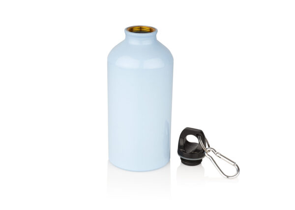 Botella de aluminio con gancho carabinero y tapa roscada. Está libre de BPA y otras sustancias nocivas, no retiene ni transmite sabores. La pintura exterior no tiene ningún tipo de componente tóxico. Tiene una capacidad de 500 ml (17 oz).