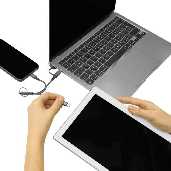 Cable de carga con llavero. Entrada: 2 en 1 (USB + USB tipo C). Salida: USB tipo C + lightning.