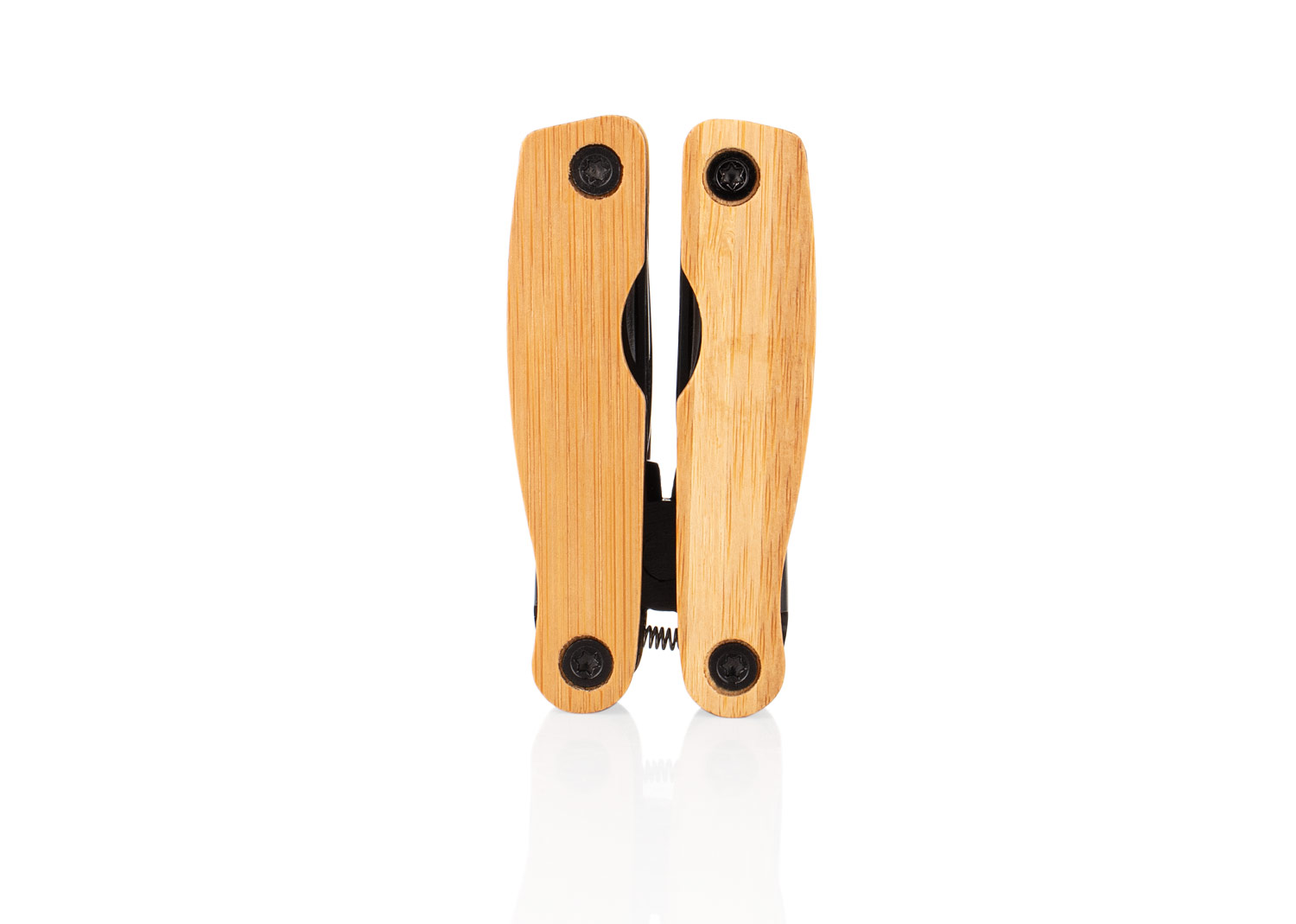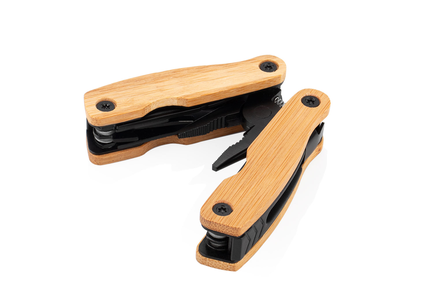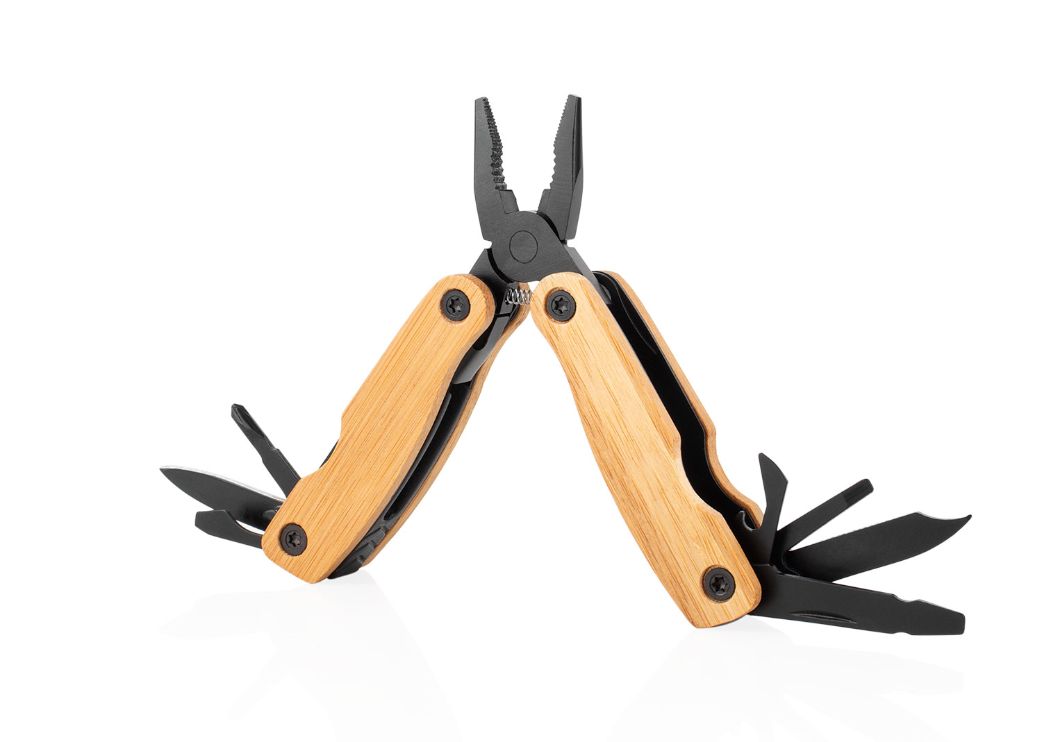 Esta herramienta multifunción cuenta con un diseño plegable y mango de madera, e integra alicates de punta fina y alicate regular (5,2 X 10,1), destornillador estrella (0,4 X 2,6) y pala (0,8 X 4), lima de uñas (0,8 X 3,6), abrelatas con removedor de ganchos, navaja (0,8 X 3,5), abrebotellas y sierra (0,6 X 3,6). Su formato compacto permite llevarla fácilmente y tener a la mano las funciones básicas para tareas cotidianas. MATERIAL: Bambú + 2cr13 MEDIDAS: Formato: (Ancho X Alto X Profundo): Abierto: (14,5 X 2,1 X 1,6). Plegado: (7 X 3,6 X 2,1). Peso: 93 gr. ÁREA DE IMPRESIÓN APROXIMADA: Láser: (4 X 0,7). MARCA: SE SUGIERE: Láser. EMPAQUE: 120 Unidades en caja máster de: 18,2 cm x 26,4 cm x 25 cm; Peso Bruto: 12,5 Kg; Peso Neto: 11,5 Kg EMPAQUE INDIVIDUAL: Caja blanca INVENTARIO: 1418