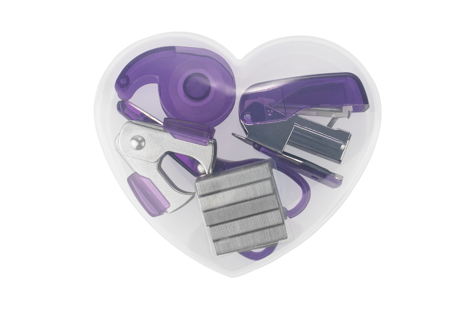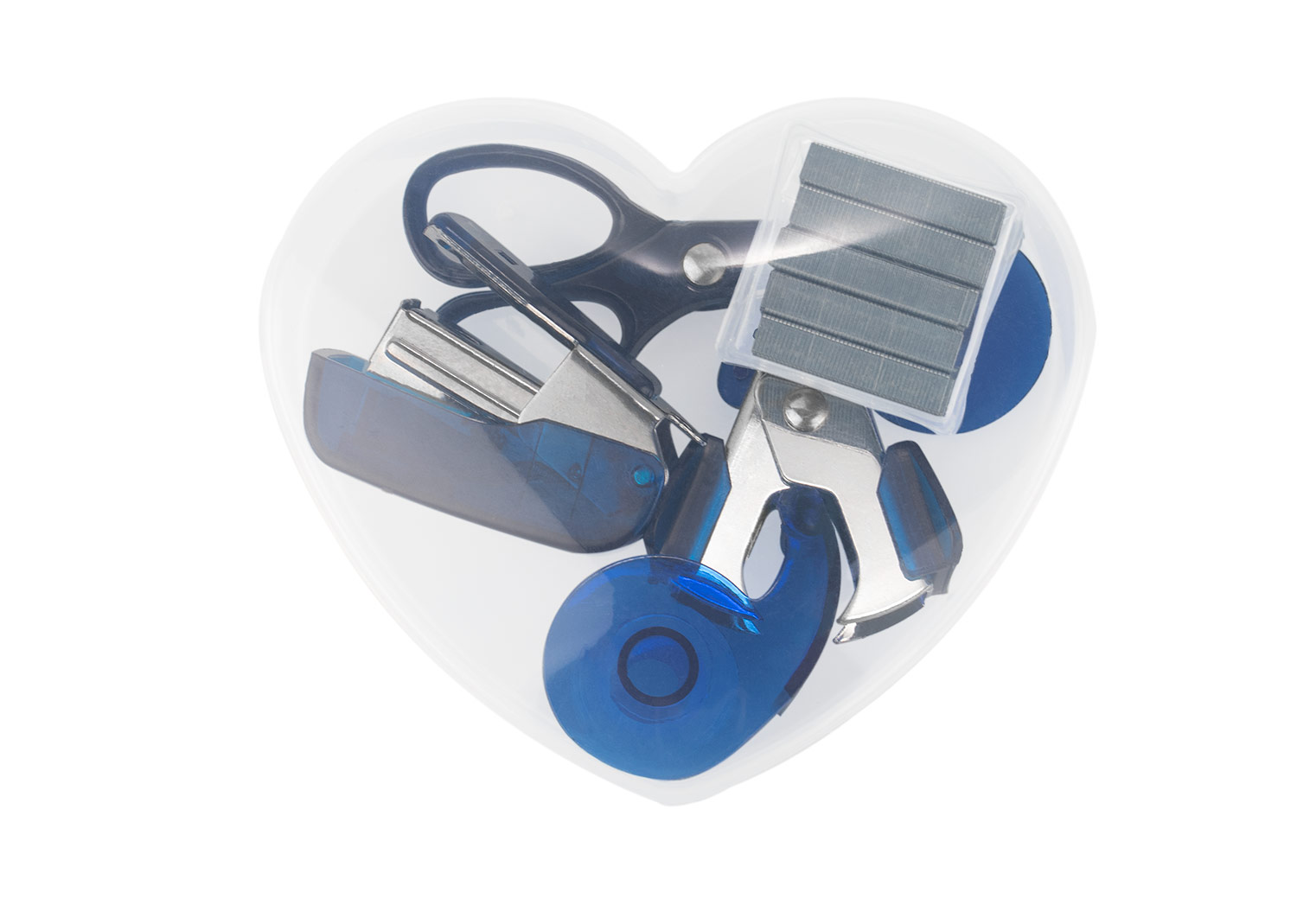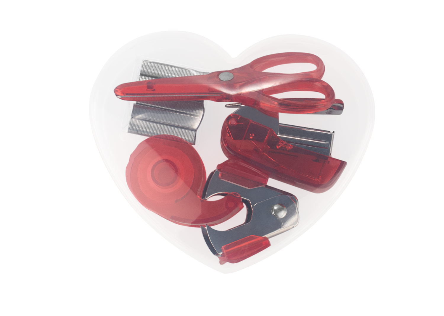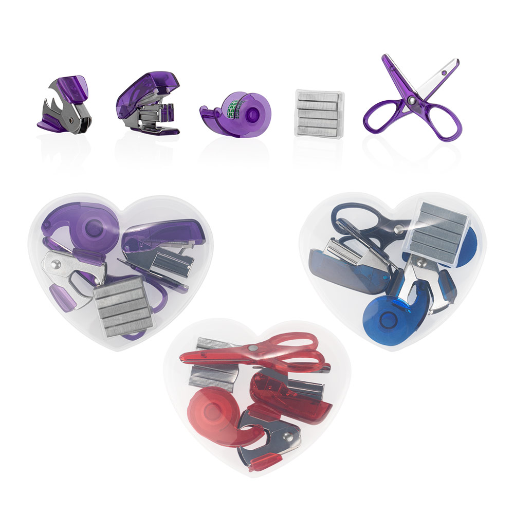 Práctico set de oficina presentado en un estuche con forma de corazón elaborado en material PP. Incluye grapadora (4,1 X 3,1 X 1,8), dispensador de cinta transparente (4 X 2,3 X 1,4), tijeras pequeñas (7,1 X 3,3), quitagrapas (3,3 X 3,3 X 1,7) y 500 grapas, ofreciendo todo lo necesario para tareas básicas de organización. Su diseño compacto y colorido lo convierte en una solución funcional y fácil de transportar para el hogar, la oficina o el estudio.
