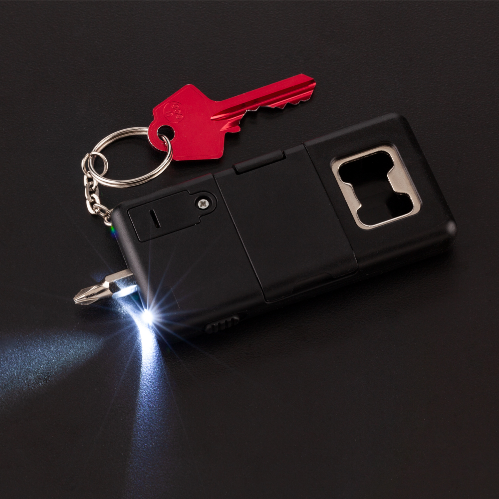 Llavero plástico con cuatro puntas de destornilladores, destapador y linterna.Medidas: 9 cm x 4.5 cm x 1.2 cm.Marca: 4 cm / Tampografía.Ficha Técnica