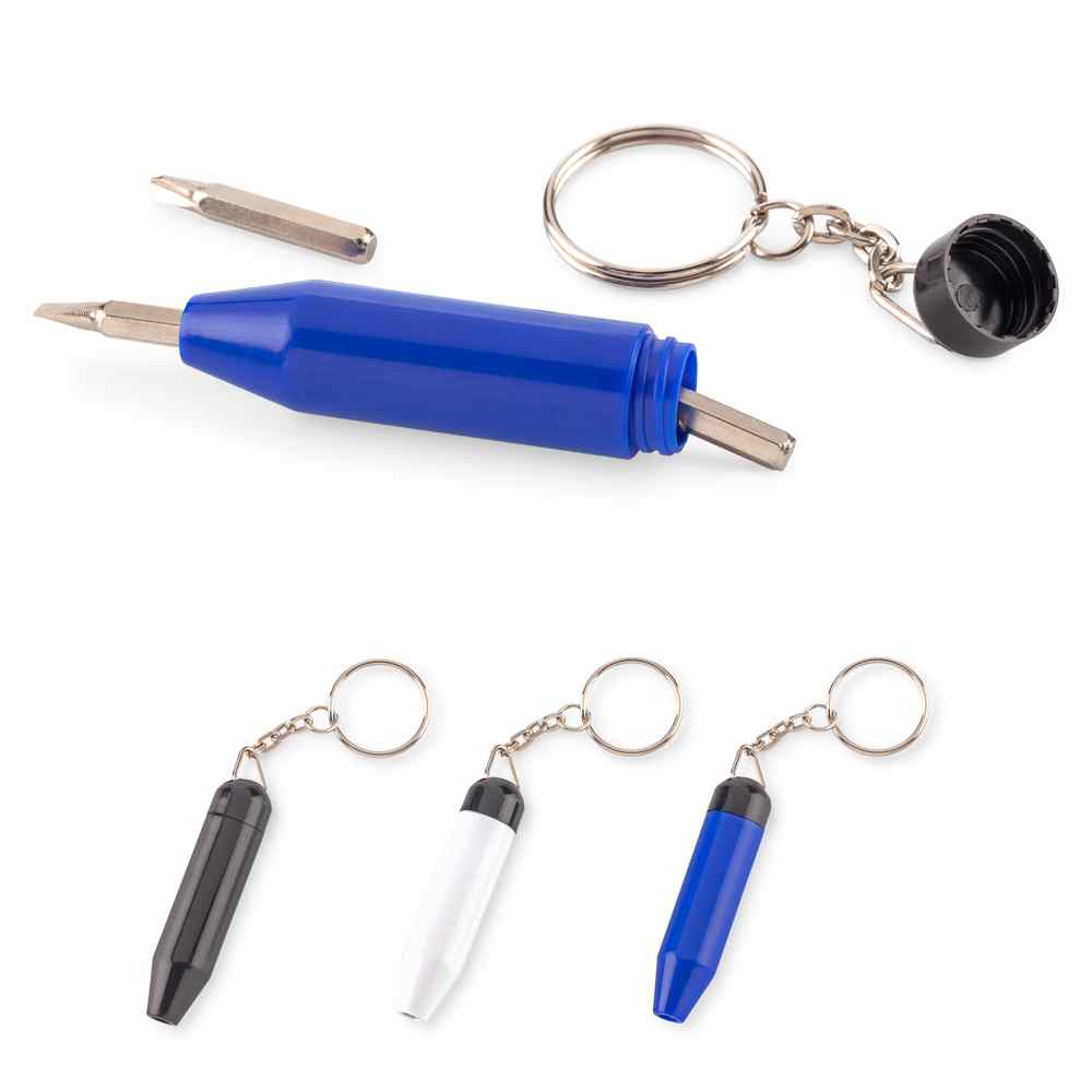 Mini set de destornilladores en estuche plástico que funciona como mango de agarre.De 3 piezas.Con llavero.Medidas: 6 cm x 1.5 cm.Marca: 2 cm / Tampografía.Ficha Técnica