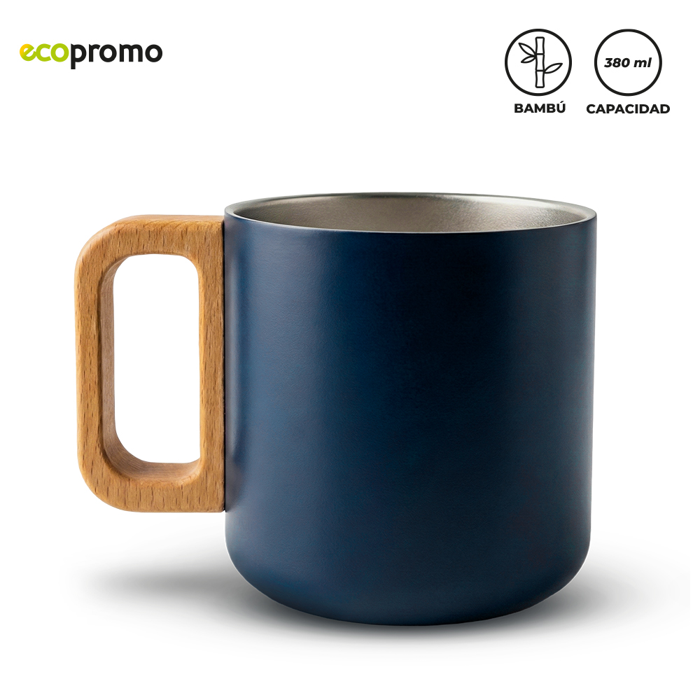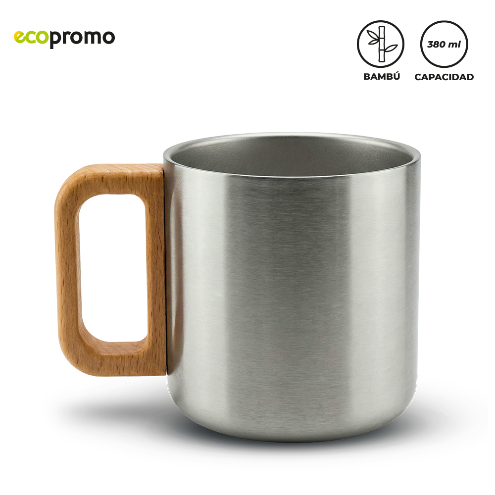 Mug en acero inoxidable doble pared con manija en bambú, el material de fabricación es de textura porosa. Empaque caja individual.Medidas: 8 cm x 8.5 cm diámetro.Marca: 3.5 cm / Tampografía – Tratamiento / Láser.Ficha Técnica