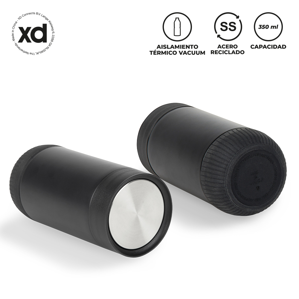 Mug doble pared vacuum en acero inoxidable reciclado, con aislamiento térmico que mantiene la bebida fría entre 8-10h aprox o caliente 3-4h aprox (puede variar dependiendo las condiciones climáticas). Tapa rosca push y base en caucho.Estuche caja individual.Medidas: 16 cm x 7 cm diámetro.Marca: 4 cm / Láser.Ficha Técnica