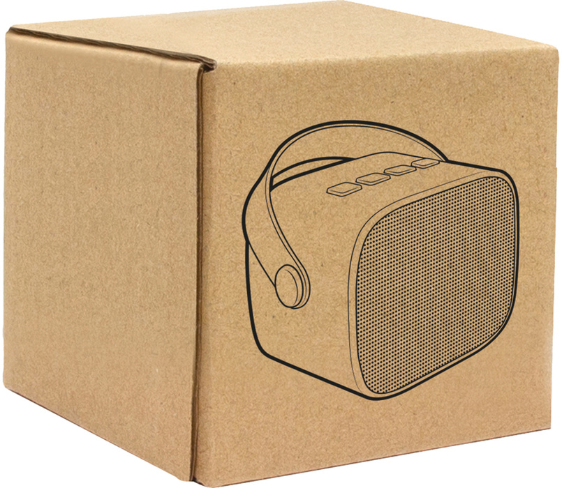 Parlante Bluetooth estéreo con Radio FM, tarjeta TF y entrada AUX. Estructura plástica color blanco y asa en poliuretano color marrón. Cable de carga y conexión USB-C en color blanco. Incluye manual de uso.
