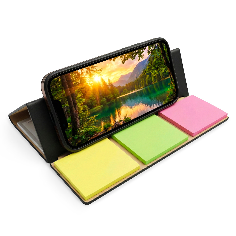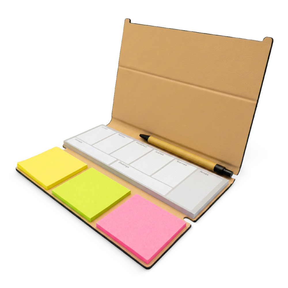 Incluye bolígrafo y juego de 3 stickies de colores.Medidas: 21 cm x 15 cm x 1.1 cm.Marca: 4.5 cm / Tampografía con Empaque y Desempaque.Ficha Tecnica