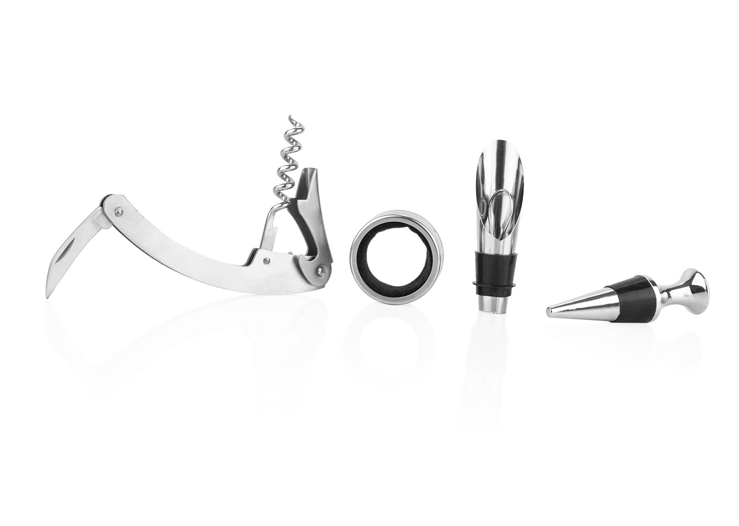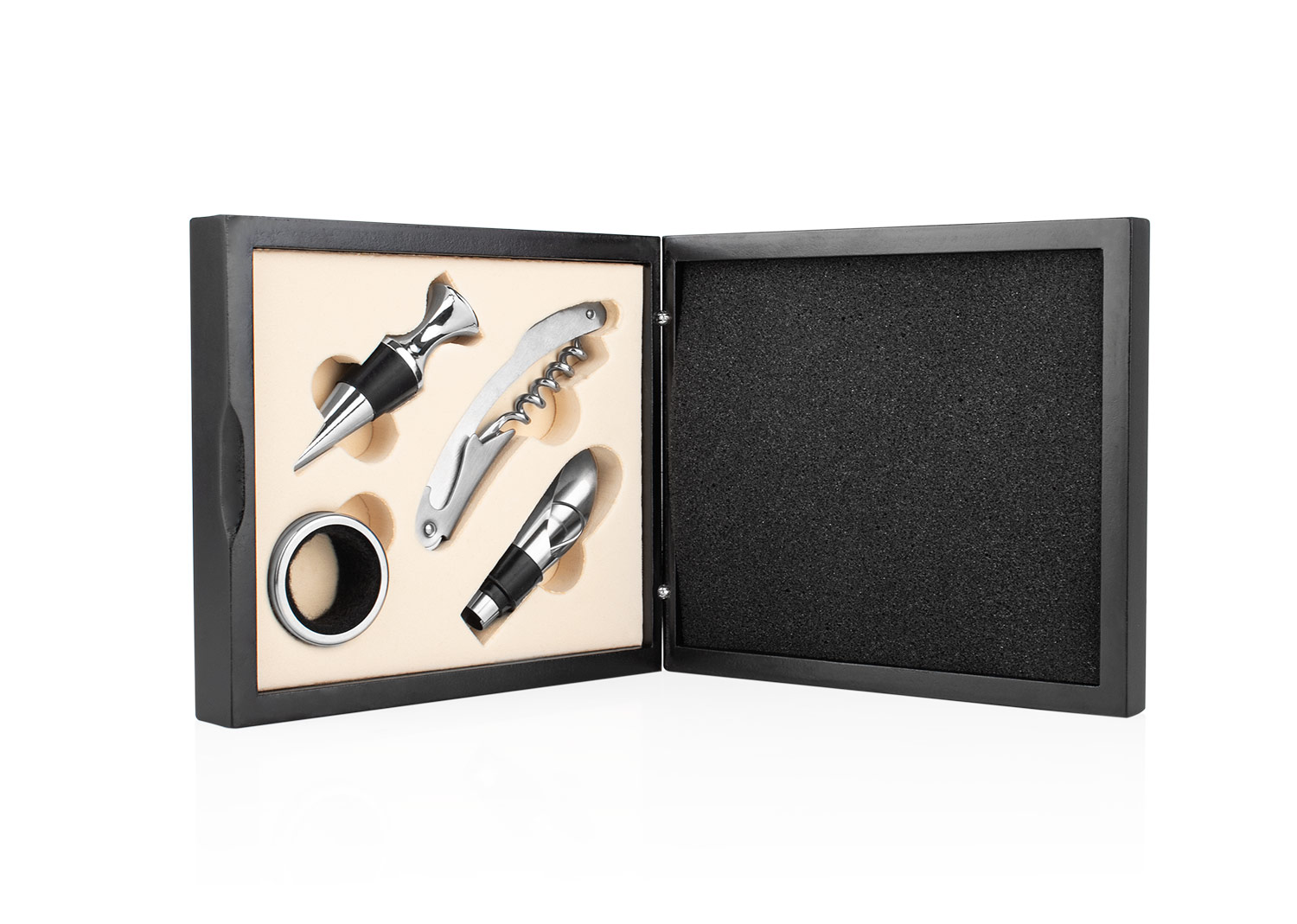 Elegante y funcional set de accesorios para vino, presentado en una caja negra con compartimentos individuales. Incluye: 1 tapón de vino en aleación de zinc y silicona (7,9 X Ø 1,9), 1 sacacorchos de camarero en acero inoxidable (2,8 X 11,1 X 1,2), 1 vertedor de vino en acero inoxidable y silicona (7,7 X Ø 1,9) y 1 collar de vino en acero inoxidable (2 X Ø 3,9).