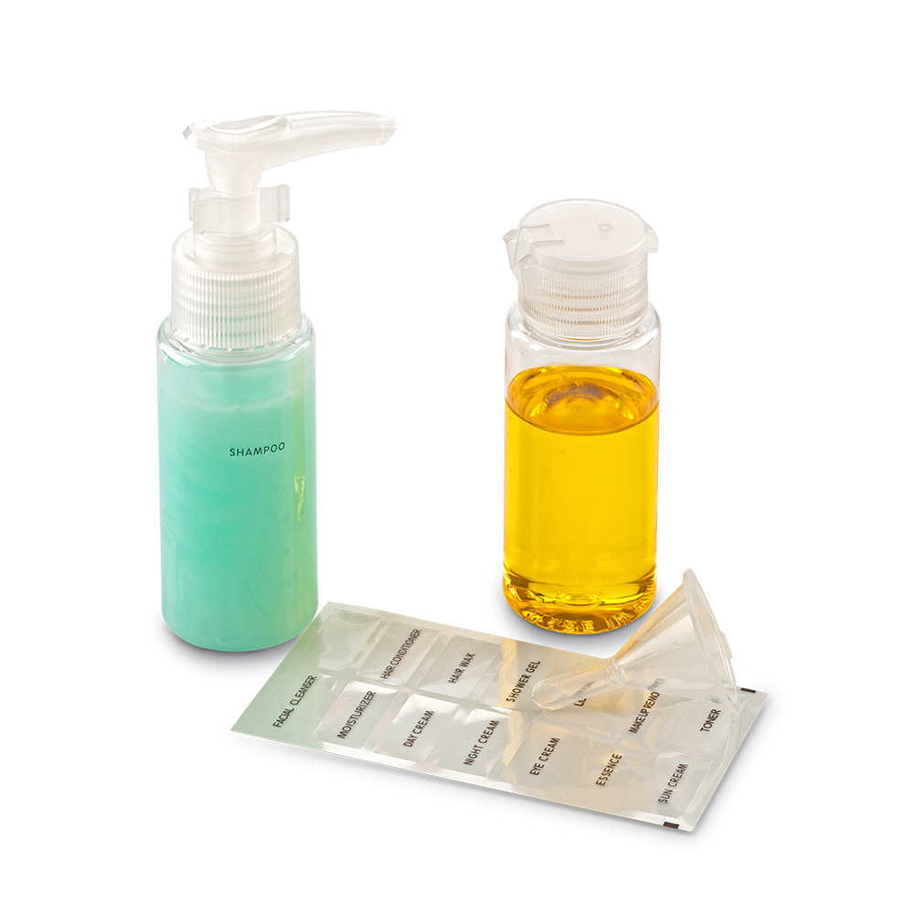 Set de 11 piezas plásticas para viaje: 3 frascos con tapa abatible (50 ml), 1 frasco dosificador (50 ml), 1 frasco tapa spray (50 ml), 2 tarros de crema (10 ml), 1 peine, 1 embudo, 1 espátula, identificadores adhesivos. Medidas Caja: 18,7 cm x 13 cm x 4,5 cm. . Marca: 8 cm / TampografíaFicha Técnica