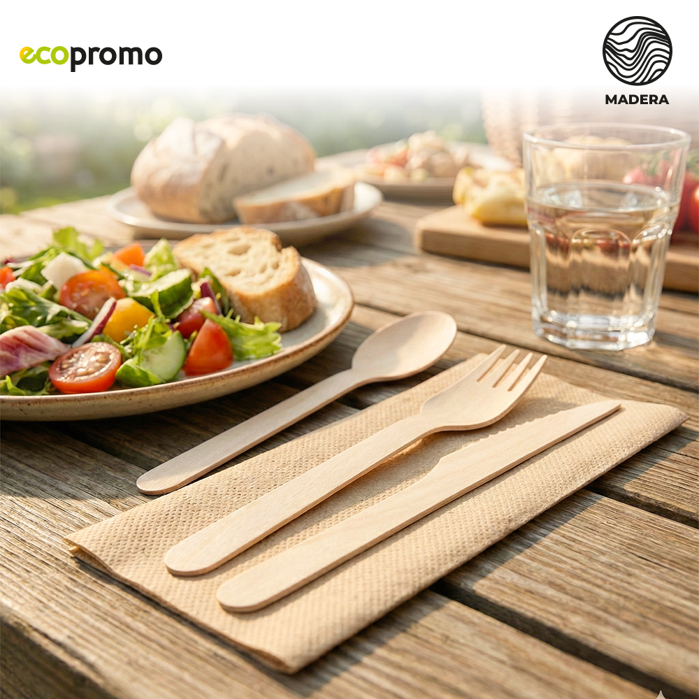 Juego de cubiertos elaborados en madera natural (Cuchara, Cuchillo y Tenedor) y servilleta de papel. En bolsa sellada por higiene tipo Kraft. Artículo para uso personal, no se admiten Cambios/devoluciones.Medidas: 21 cm x 5 cm.Marca: 2 cm / Tampografía en la bolsa.Ficha Tecnica
