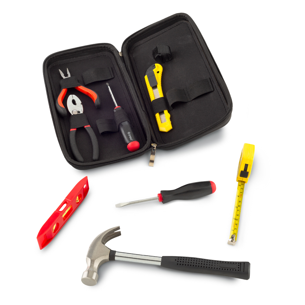 Set de herramientas de 8 piezas en estuche de goma EVA.Empaque caja individual.Medidas: 26.5 cm x 15 cm x 5 cm.Marca: 6 cm / Screen.Ficha Técnica