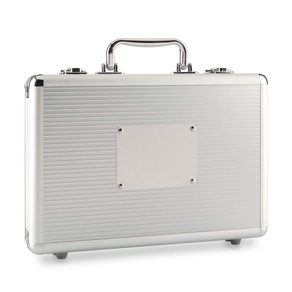 Set de póker en caja de aluminio.Incluye dos naipes de cartas, 5 dados,