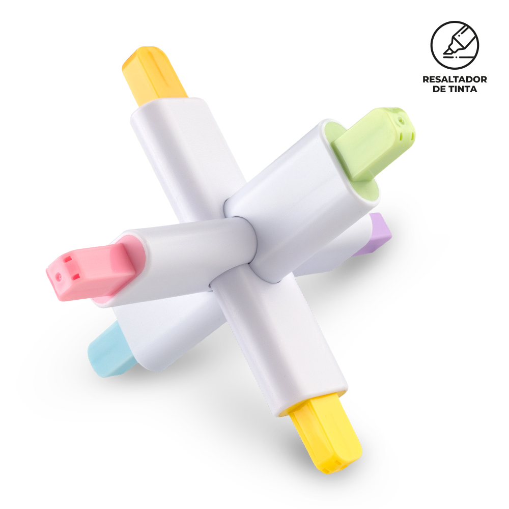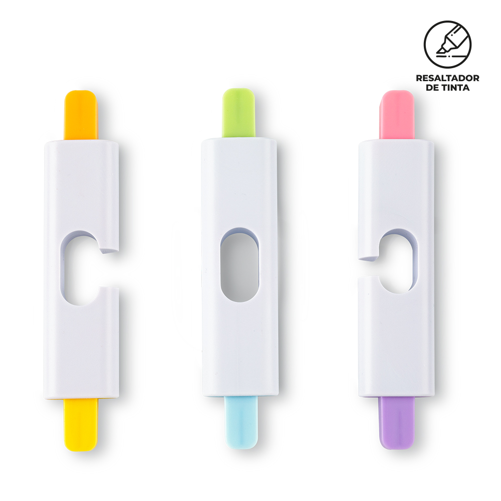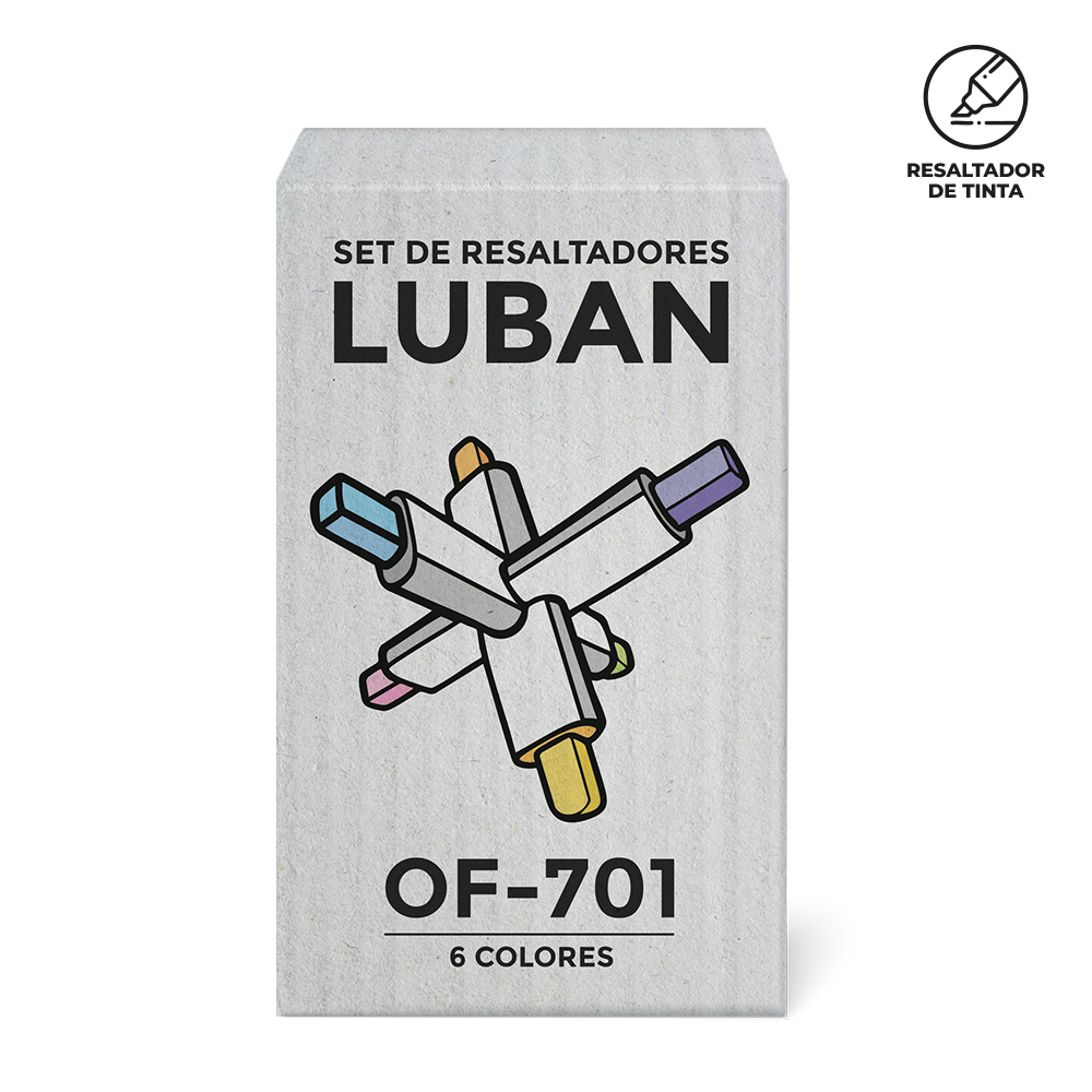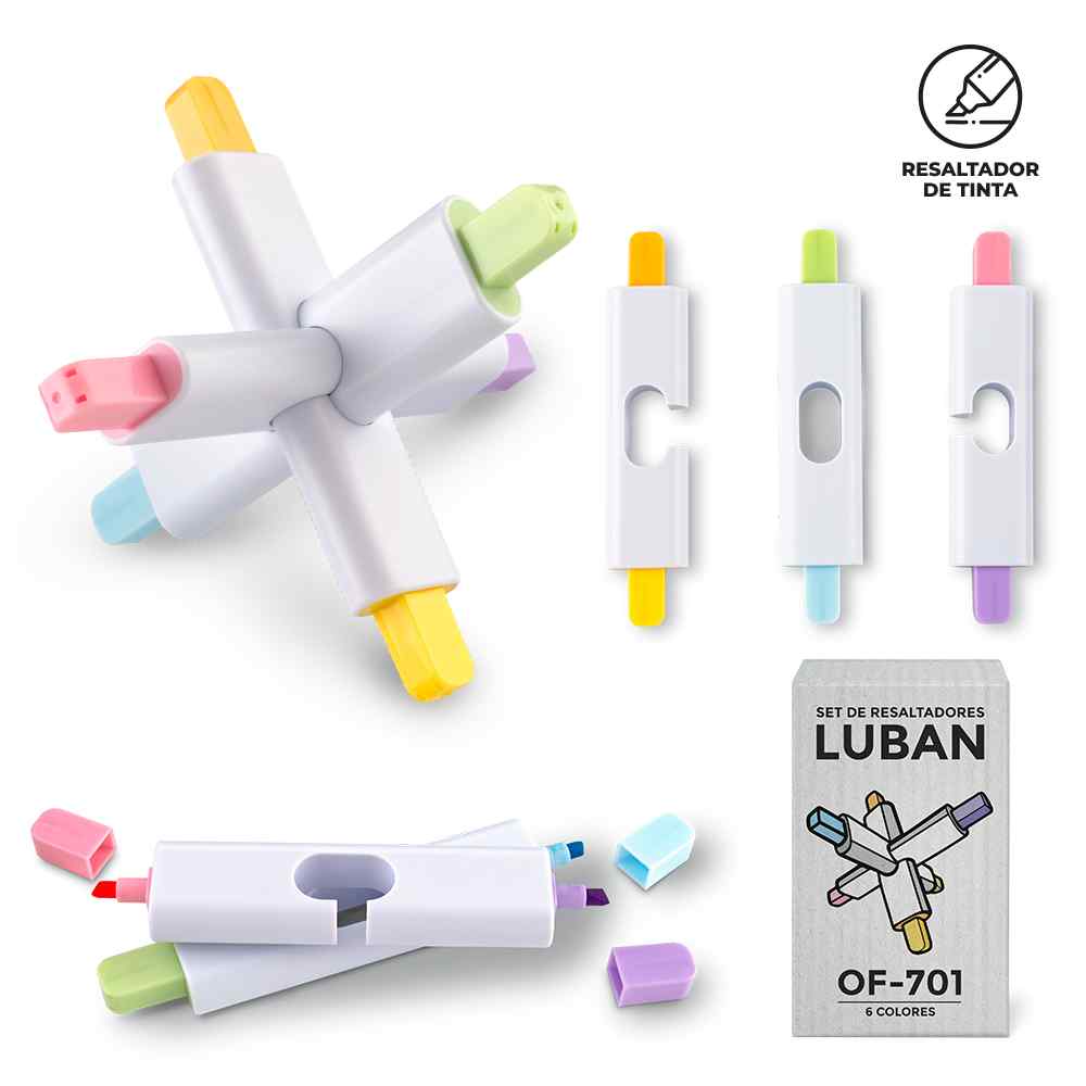 Set de 6 resaltadores de tinta.Empaque caja individual.Medidas Caja: 12.8 cm x 8 cm x 1.5 cm.Marca: 1.5 cm / Tampografía.Ficha Técnica