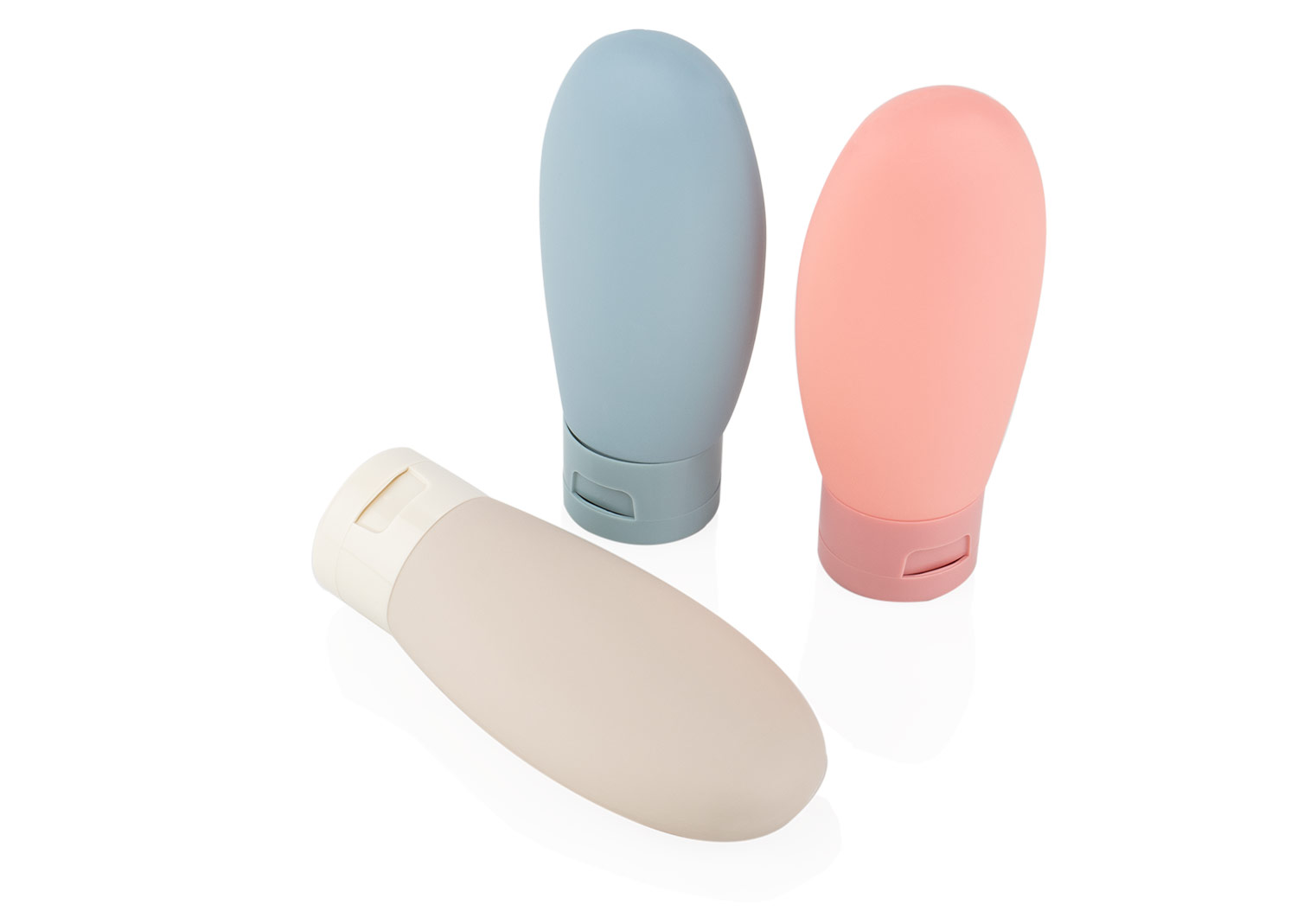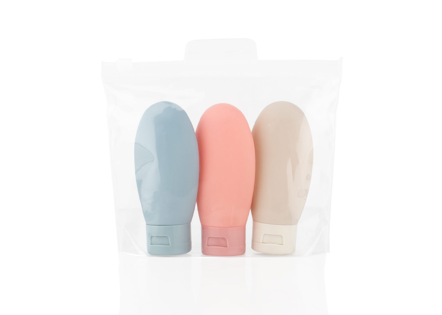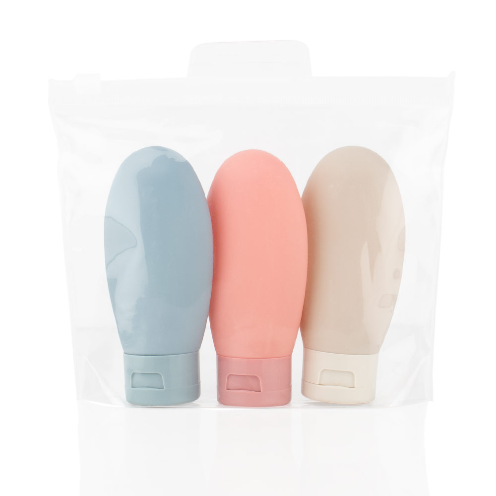 Set de botellas de viaje que incluye tres envases de 60 ml (5 X 10,8) con tapa de cierre a presión, ideales para transportar líquidos como shampoo, gel o loción; vienen en una bolsa transparente con sistema para colgar, lo que facilita su organización y acceso durante viajes o desplazamientos.