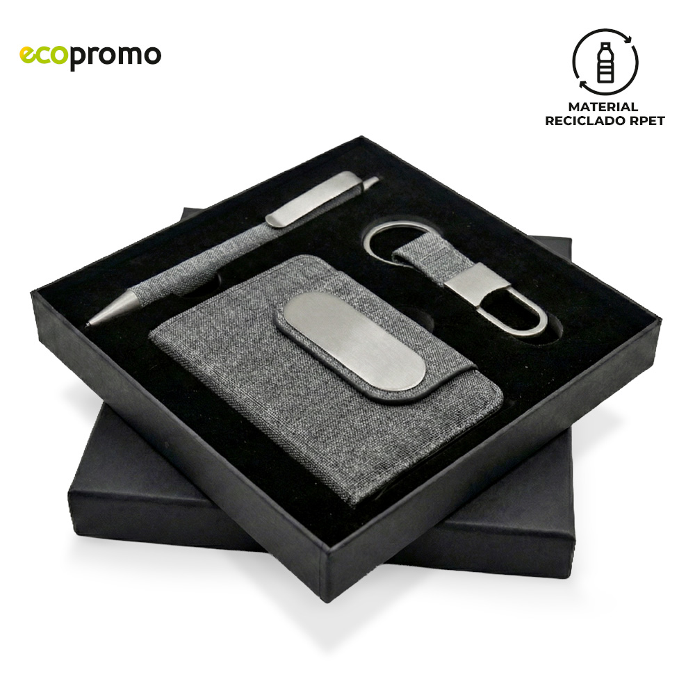 Set de bolígrafo metálico recubierto en tela reciclada RPET, tarjetero metálico recubierto en tela reciclada RPET y llavero reciclado RPET. Empaque caja individual.Medidas caja: 16.4 cm x 16.4 cm x 2.5 cm.Marca: Bolígrafo: 2 cm / Llavero: 1 cm / Portatarjetas: 3 cm / Láser.Ficha Tecnica