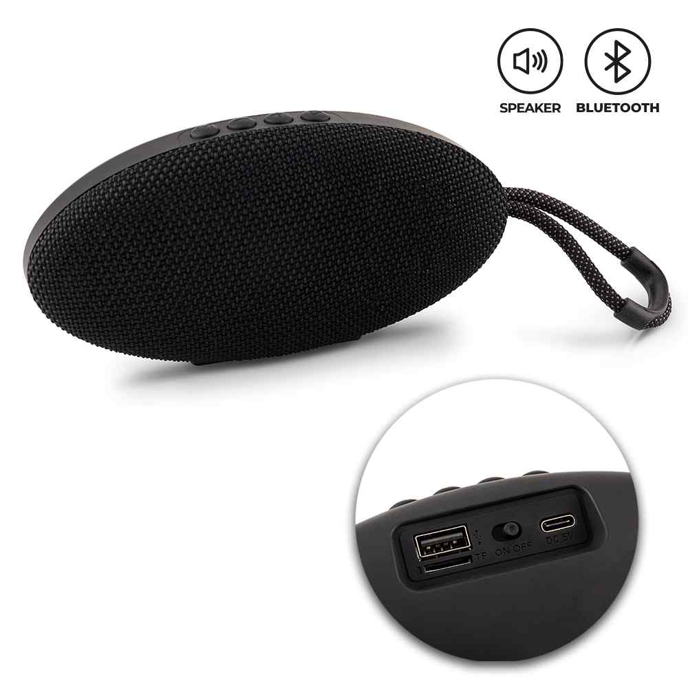 Speaker Bluetooth plástico recubierto en tela. Tiempo de reproducción: 3-4 horas. Batería: 1200 mAh. Potencia: 5W. Incluye cargador inalámbrico de 5W. Lector de tarjeta TF y USB (no incluidas). Puerto Tipo C para carga. Empaque caja individual. Medidas: 10.8 cm x 8.2 cm diámetro. Marca: 4 cm / Screen / Láser.Ficha Técnica