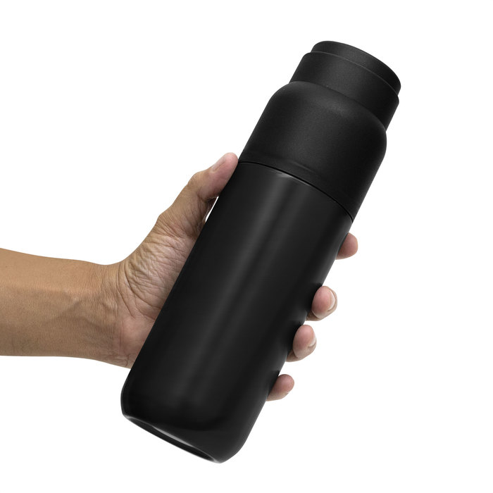 Termo con taza. Termo Doble pared sellado al vacío. Interior en acero 304 y exterior en acero 201. Tapa y taza plásticas a rosca color negro. Tapón con apertura y cierre a presión. Mantiene por más de 12 hs la temperatura de las bebidas calientes y 24 hs de las bebidas frías.